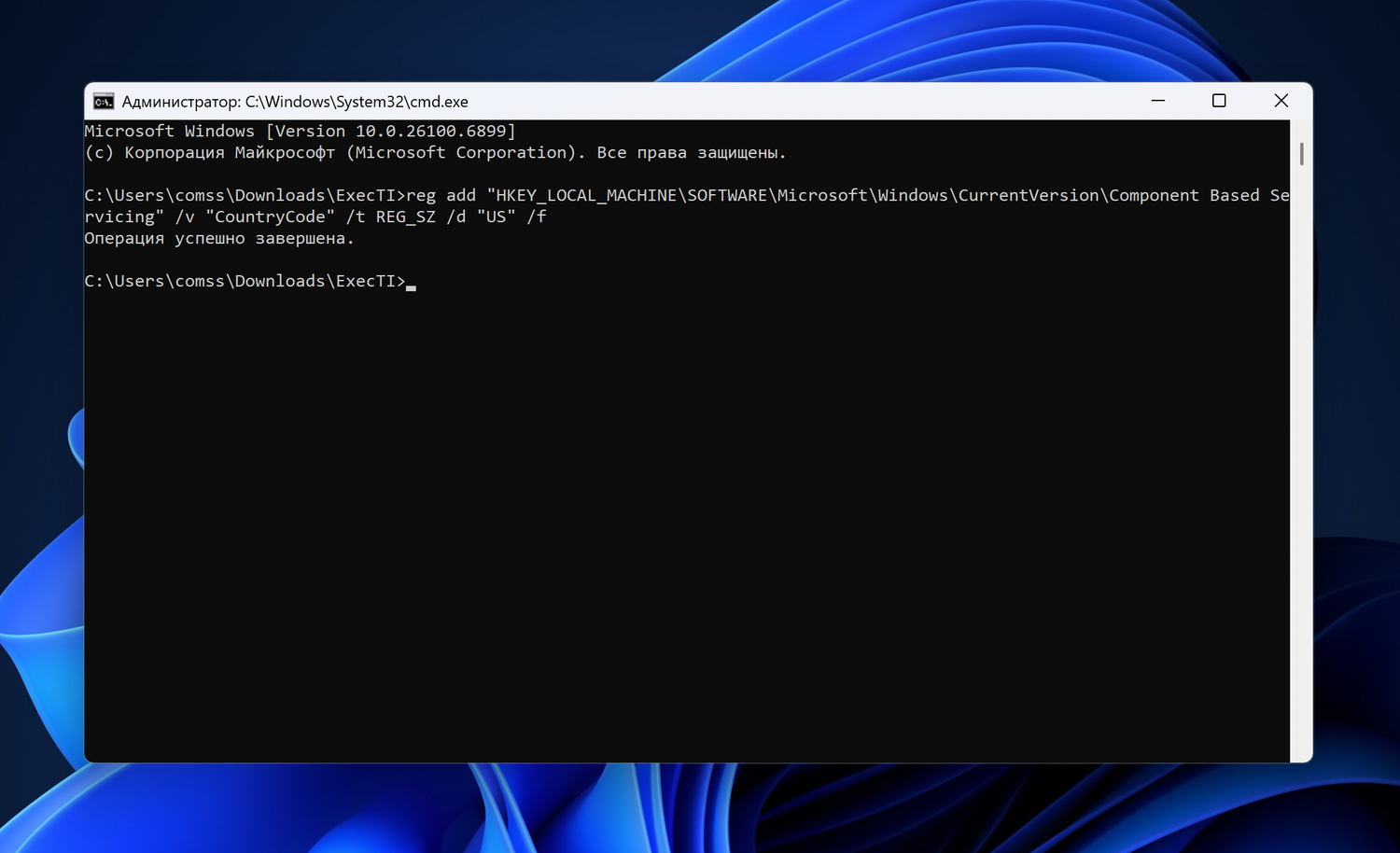 reg add "HKEY_LOCAL_MACHINE\SOFTWARE\Microsoft\Windows\CurrentVersion\Component Based Servicing" /v "CountryCode" /t REG_SZ /d "RU" /f