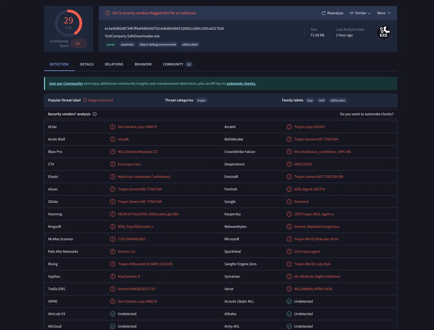 Файл назывался TestCompany.SafeDownloader.exe. По данным сервиса VirusTotal, его признали вредоносным 29 из 72 антивирусов. Пользователи, изучившие вредоносное ПО, утверждают, что это Crypto Clipper — не майнер, а программа, подменяющая адреса криптокошельков в буфере обмена на адреса злоумышленников.