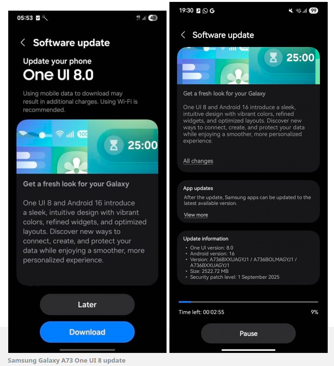Прошивка с номером сборки A736BXXUAGYJ1 уже начала распространяться в странах Азии. Размер пакета — около 2,5 ГБ, что указывает не только на обновление интерфейса, но и на включение полного набора системных изменений. В составе патча присутствуют исправления безопасности за сентябрь 2025 года, несмотря на то, что релиз отстаёт по срокам почти на два месяца.