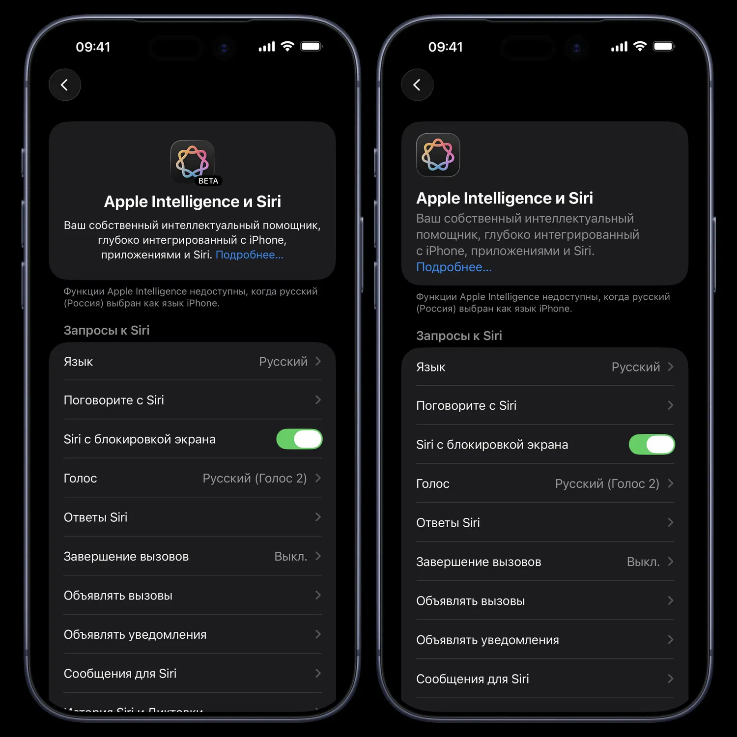 - Apple Intelligence и Siri — раздел настроек получил выравнивание по левому краю, а с иконки исчезла надпись BETA.