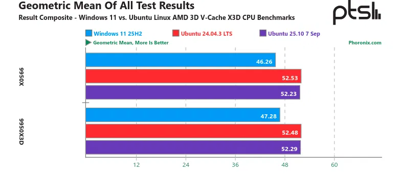 Сравнение показало, что при одинаковом аппаратном обеспечении Ubuntu 24.04.3 LTS и Ubuntu 25.10 обеспечивают более высокую производительность процессоров AMD Ryzen 9 9950X и 9950X3D по сравнению с Windows 11 25H2. При этом различия между двумя моделями процессоров в тестах оказались минимальными.