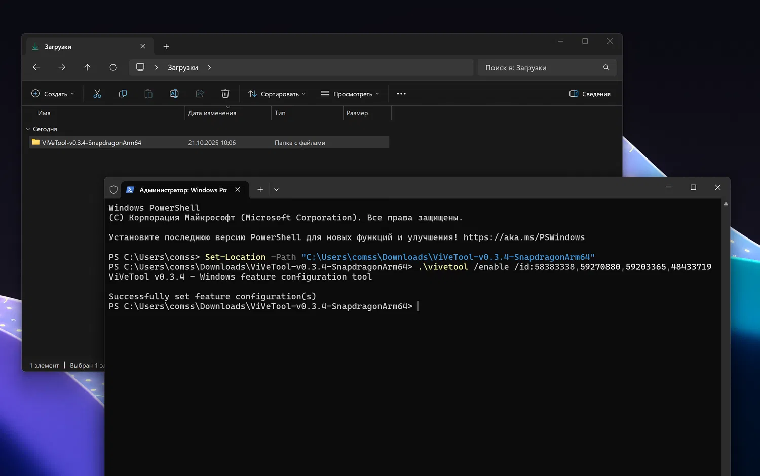 Примечание: В примерах выше используется Терминал Windows с профилем PowerShell. Если вы используете профиль Командная строка, замените начало команды .\vivetool на vivetool.