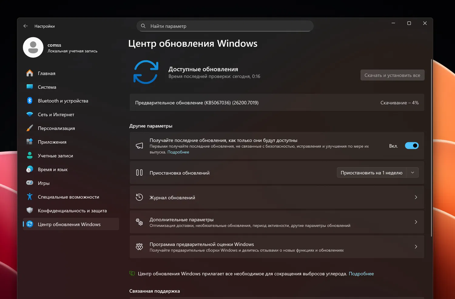 Обновлено: 29.10.2025. Обновление KB5067036 (Build 26200.7019) Preview для Windows 11, версия 25H2 доступно для установки в Центре обновления Windows как «необязательное обновление» и для ручной загрузки в Каталоге Центра обновления Майкрософт.