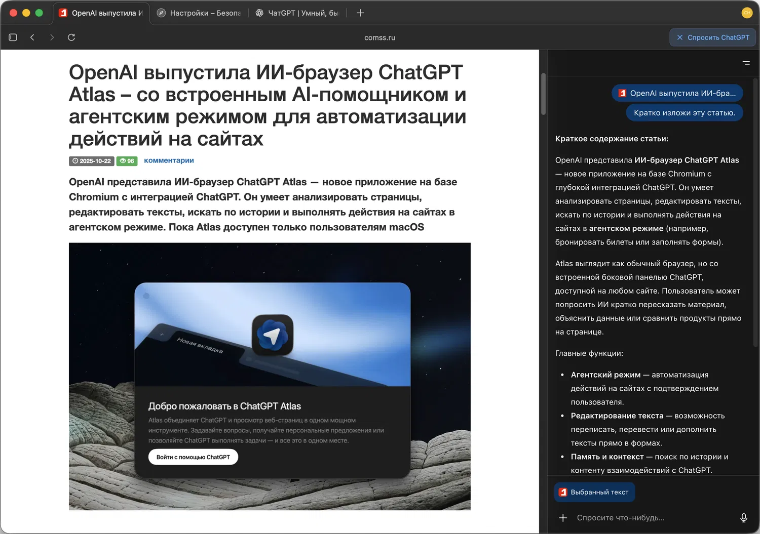 OpenAI выпустила ИИ-браузер ChatGPT Atlas — новое приложение на базе Chromium с глубокой интеграцией ChatGPT. Atlas сочетает привычный интерфейс браузера и встроенный искусственный интеллект, который помогает анализировать веб-страницы, редактировать тексты, искать информацию по истории и даже выполнять действия на сайтах в «Режиме агента». Пока браузер доступен только для macOS и официально недоступен в России, но его можно запустить с помощью Comss.one DNS.