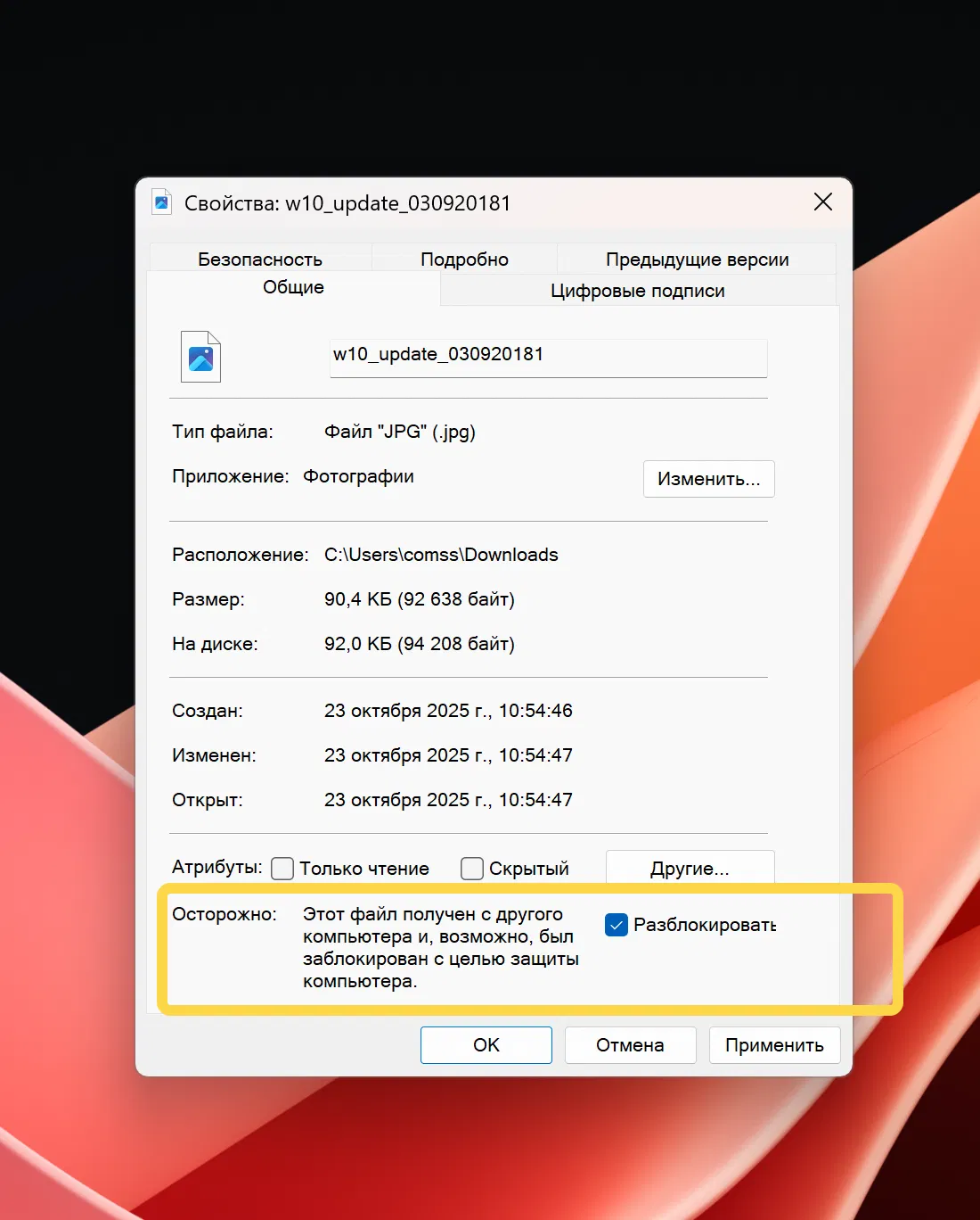 После этого предпросмотр снова станет доступен — но только для выбранного файла. Microsoft подчеркивает, что это стоит делать только для доверенных файлов.