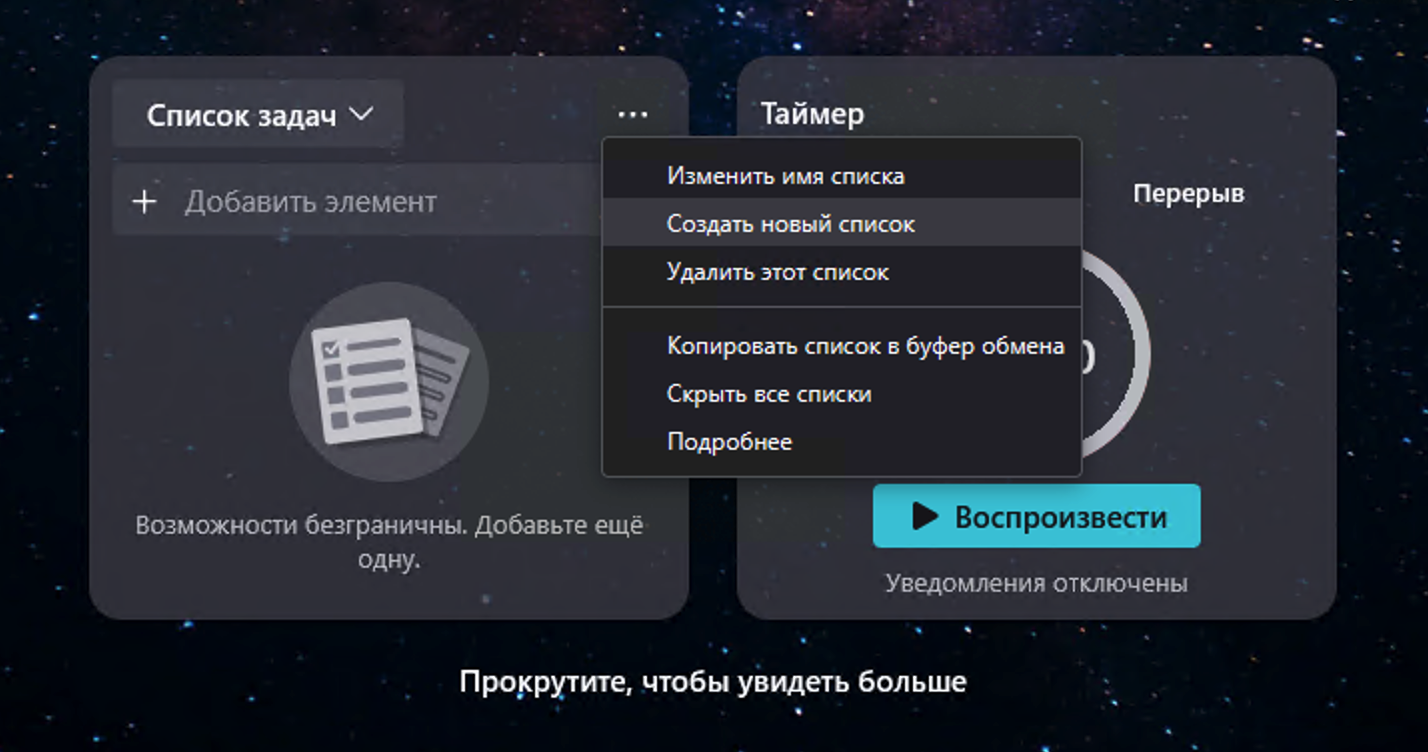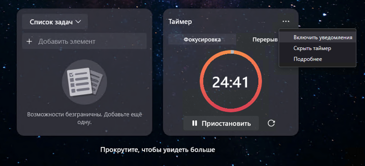 Виджет «Таймер» достаточно прост: в нём есть два режима — 25-минутный таймер и 5-минутный перерыв. Выберите нужный режим, нажмите Воспроизвести, и начнётся обратный отсчёт. Вы можете задать собственное время, наведя курсор на минуты или секунды и введя нужное число. Чтобы включить оповещения, откройте меню виджета и выберите Включить уведомления — тогда при завершении таймера появится оповещение.