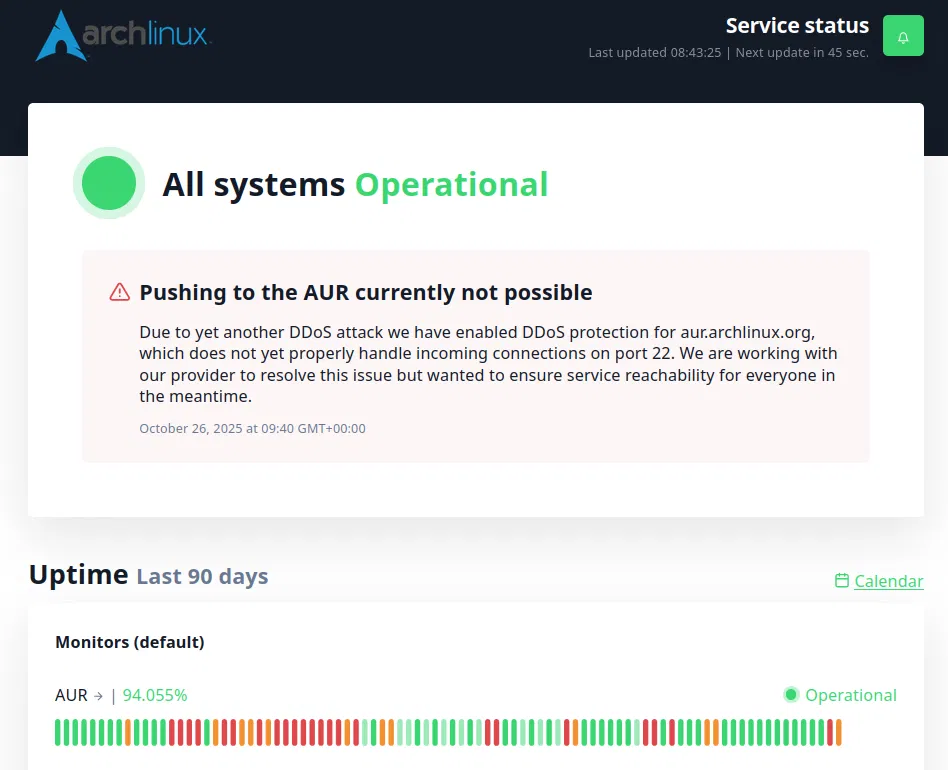 Команда Arch Linux вновь столкнулась с распределённой DDoS-атакой, направленной на инфраструктуру репозитория AUR. Для снижения последствий был активирован механизм защиты на домене aur.archlinux.org, что позволило сохранить доступность веб-интерфейса, но вызвало серьёзные ограничения для разработчиков.