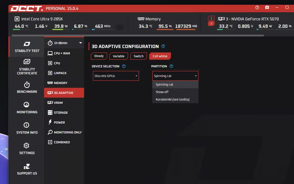 Новая функция встроена в тест 3D Adaptive (меню Stability Test > 3D Adaptive > Coil Whine). В режиме Coil Whine OCCT модулирует нагрузку на GPU, что вызывает колебания катушек и вентиляторов — фактически заставляя видеокарту «петь». На момент выхода версии 15 пользователям доступны три «мелодии», но в будущем разработчики планируют добавить больше и даже разрешить создание собственных звуковых шаблонов.