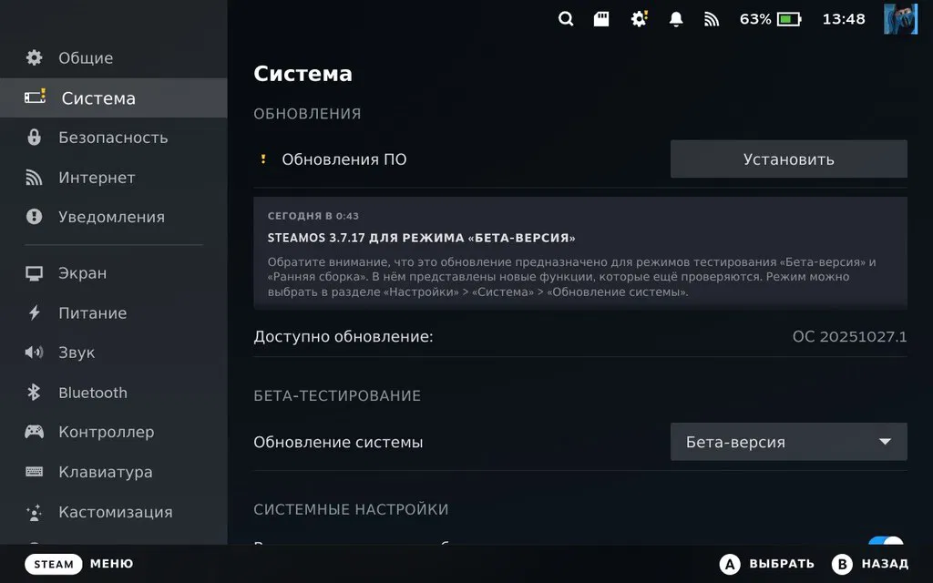 SteamOS 3.7.17 Beta доступна на каналах Beta (Бета-версия) или Preview (Ранняя сборка). Чтобы получить обновление, перейдите в Настройки > Система > Бета-тестирование и выберите один из этих вариантов.