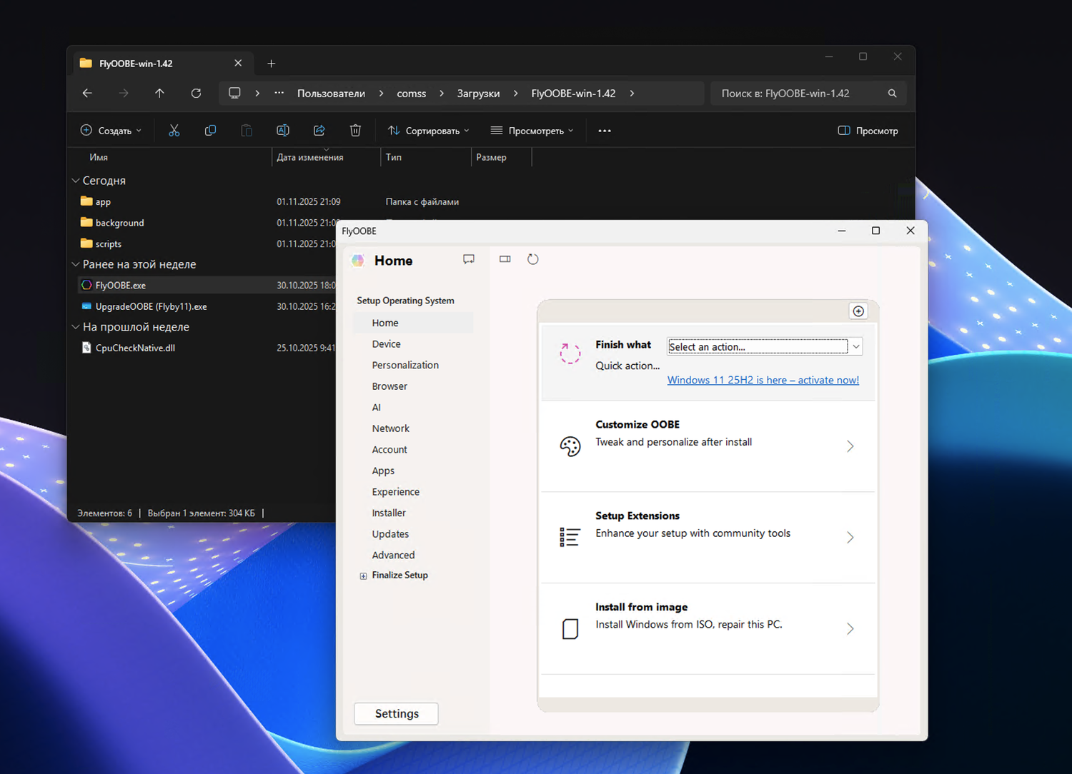 - Разделение компонентов: утилита UpgradeOOBE (Flyby11) теперь полностью отделена от FlyOOBE и используется только для обновления Windows 10 > 11. FlyOOBE же сфокусирована исключительно на кастомизации Windows 11.