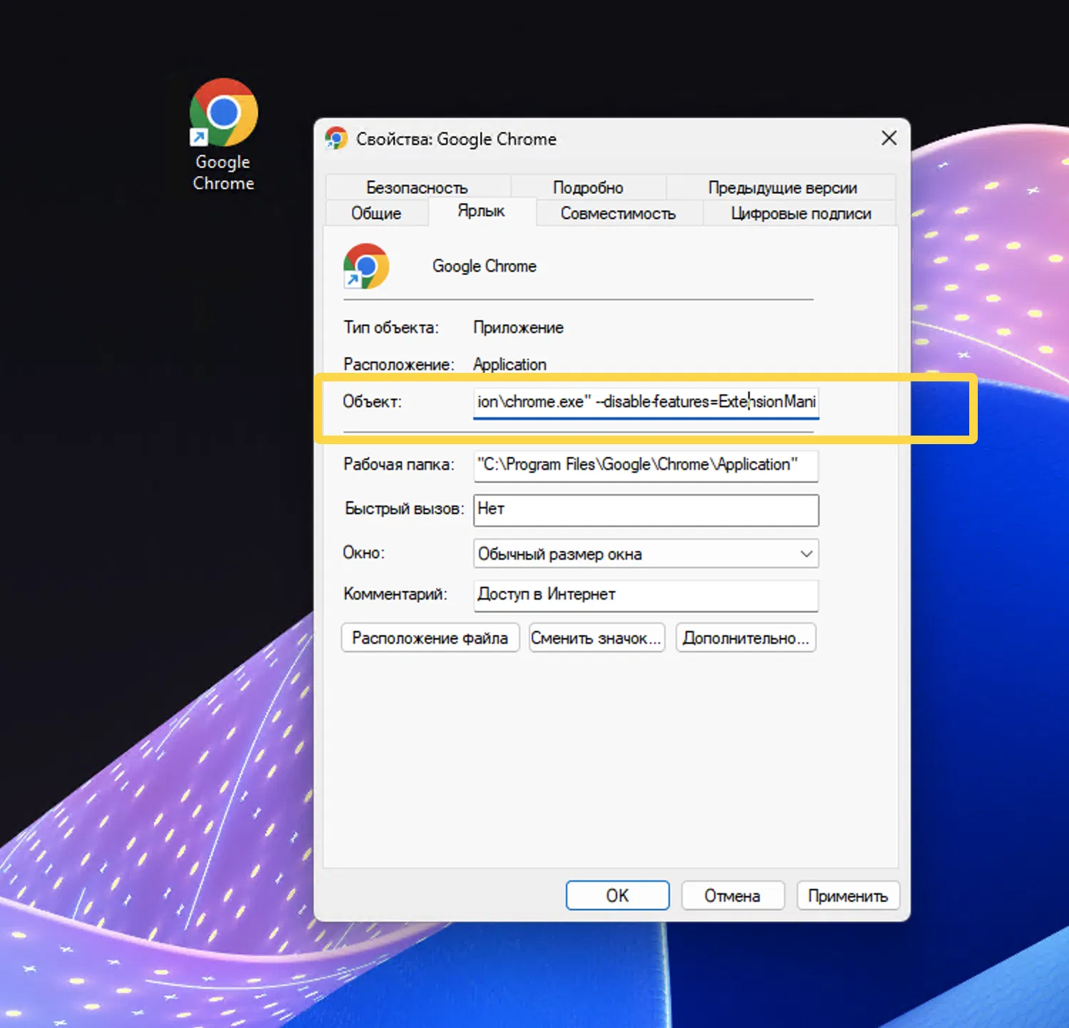 - В поле Объект после строки “…chrome.exe” через пробел добавьте код: