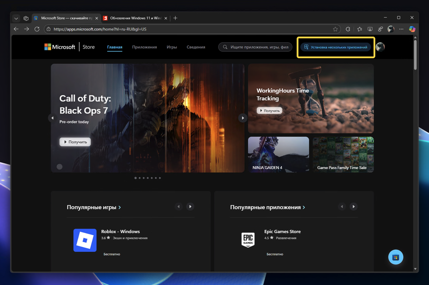 Начиная с 5 ноября 2025 года, при посещении Microsoft Store через браузер вы увидите новую кнопку «Установка нескольких приложений», ведущую на страницу со списком программ, распределенных по категориям для удобства. Здесь вы можете выбрать нужные приложения, а затем нажать Установить выбранное, после чего скачается .exe-файл. При запуске этого файла установка передается приложению Microsoft Store, которое и выполняет загрузку и установку.
