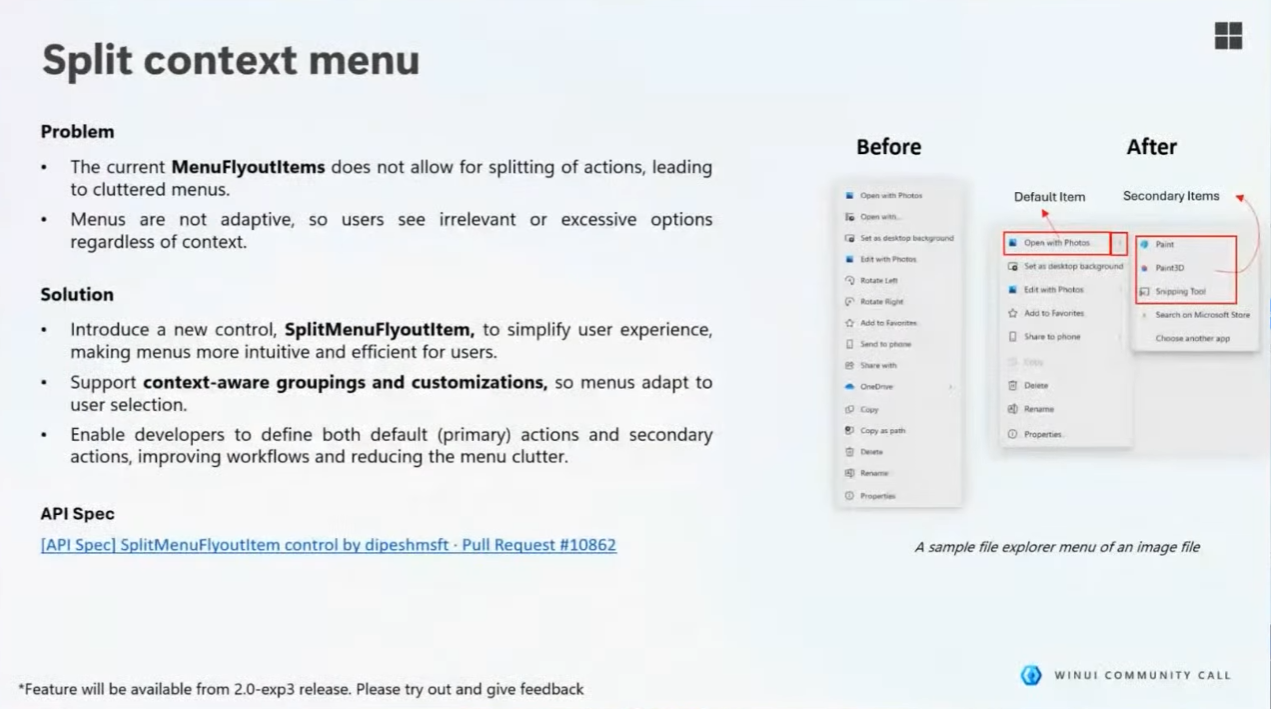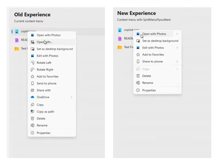 Главное нововведение — элемент SplitMenuFlyoutItem, который должен помочь избавиться от громоздких меню. Он позволит создавать «гибридные подменю», объединяя основное действие (например, «Открыть в Фотографиях) и дополнительные опции в одном пункте. Пользователь сможет сразу выполнить действие или нажать стрелку рядом, чтобы увидеть другие функции.