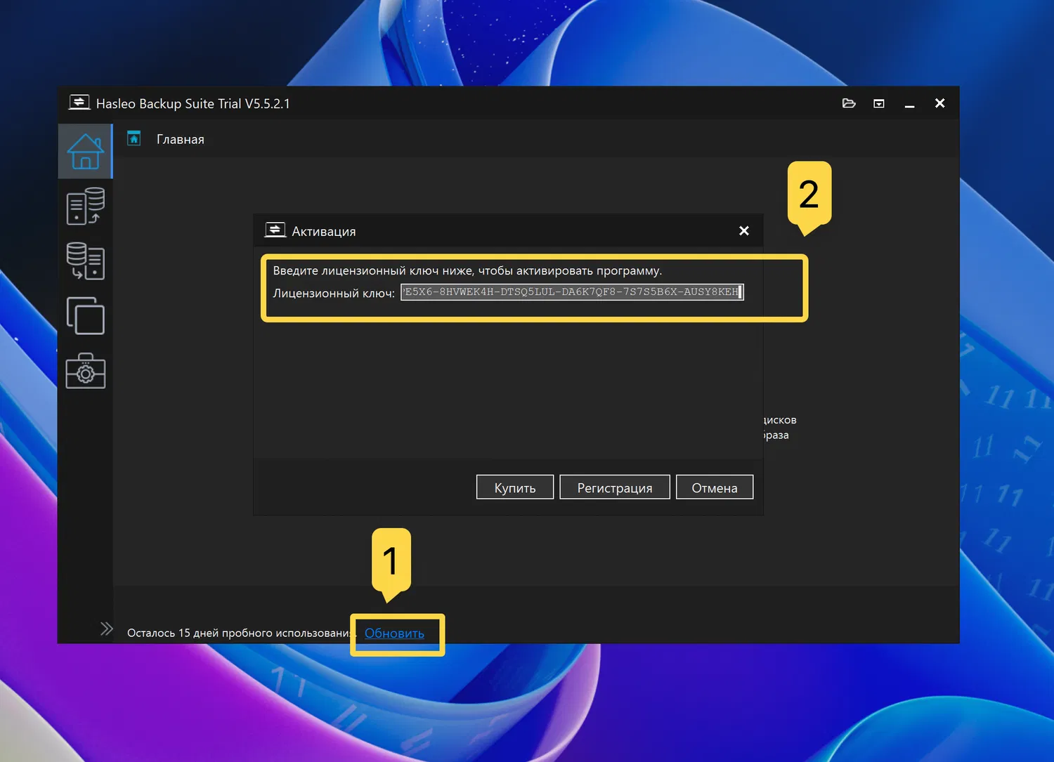 2. Откройте программу и активируйте годовую лицензию в меню Обновить следующим лицензионный кодом: