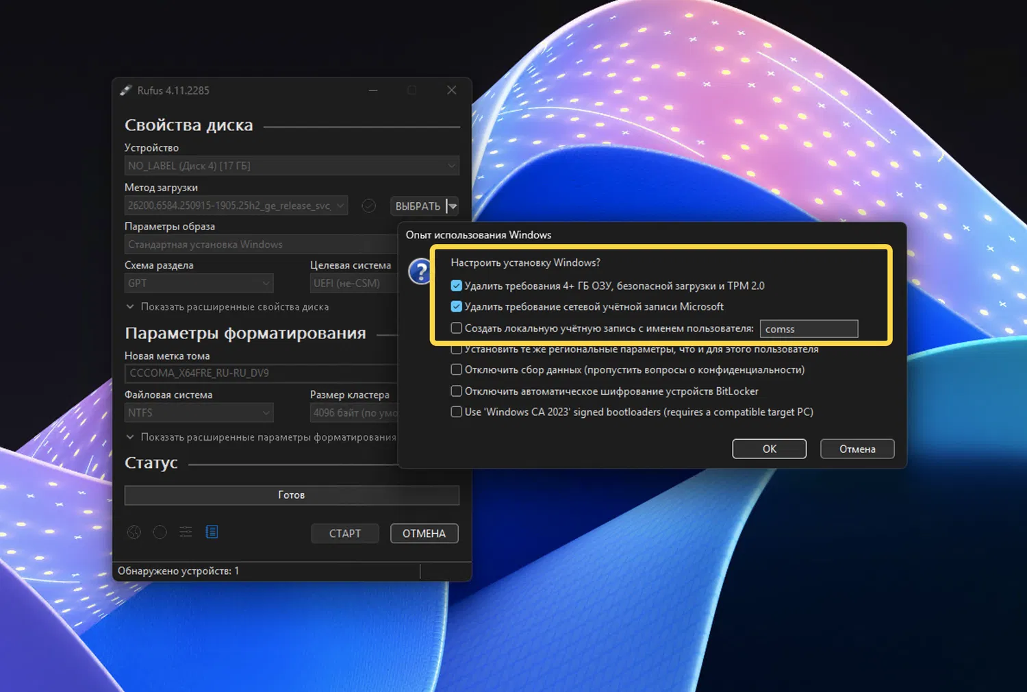 Существуют утилиты, позволяющие установить Windows 11 на неподдерживаемое «железо», пропустив проверку требований. Например, программа Rufus при создании загрузочной флешки предлагает опцию отключить проверку на наличие 4 ГБ ОЗУ, Secure Boot и TPM 2.0. С её помощью можно сделать установочный USB-носитель, с которого Windows 11 поставится даже на несовместимый официально ПК. Ещё один вариант – утилита Flyoobe (преемник проекта FlyBy11). Это стороннее приложение, созданное специально для перехода с Windows 10 систем: оно автоматизирует обход проверок оборудования, позволяя поставить Windows 11 без требуемого TPM, с малым объёмом памяти и пр.. По сообщениям, Flyoobe помог сотням тысяч пользователей обновиться, минуя ограничения.