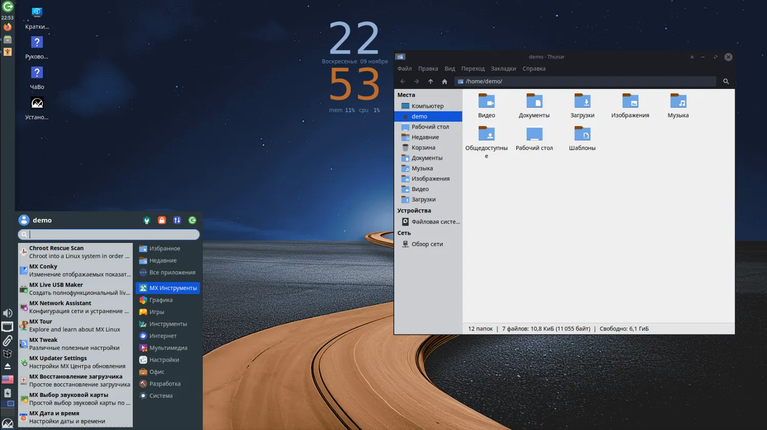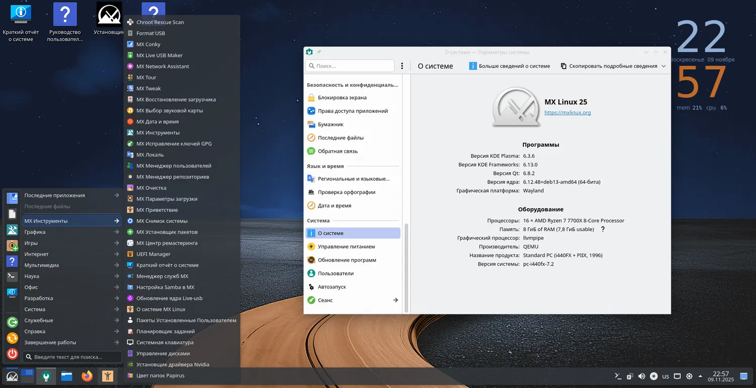 В MX Linux 25 обновлены темы оформления mx-ease и mx-matcha. Пакет Conky получил новые конфигурации и возможность переключения между 12-часовым (AM/PM) и 24-часовым форматами отображения времени в зависимости от локали.