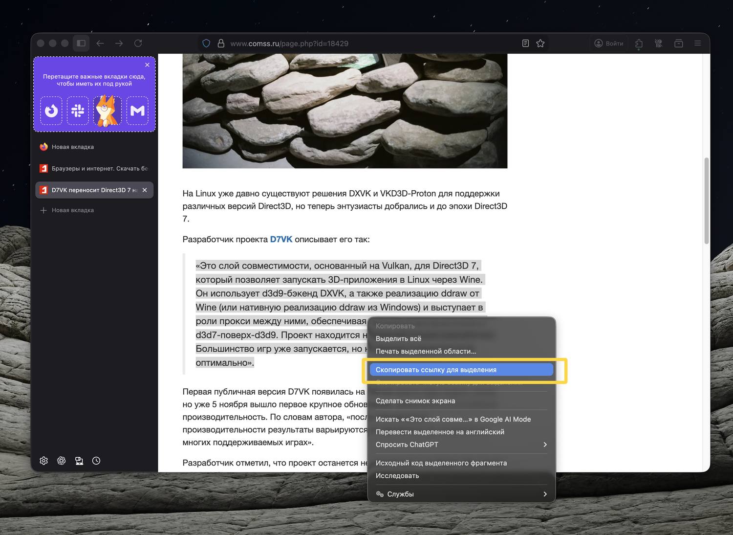 Ещё одно улучшение — новая функция Copy Link to Highlight. Она позволяет делиться ссылкой на конкретный фрагмент текста на странице. При открытии такой ссылки Firefox автоматически подсвечивает нужный участок, облегчая совместную работу и обмен информацией.