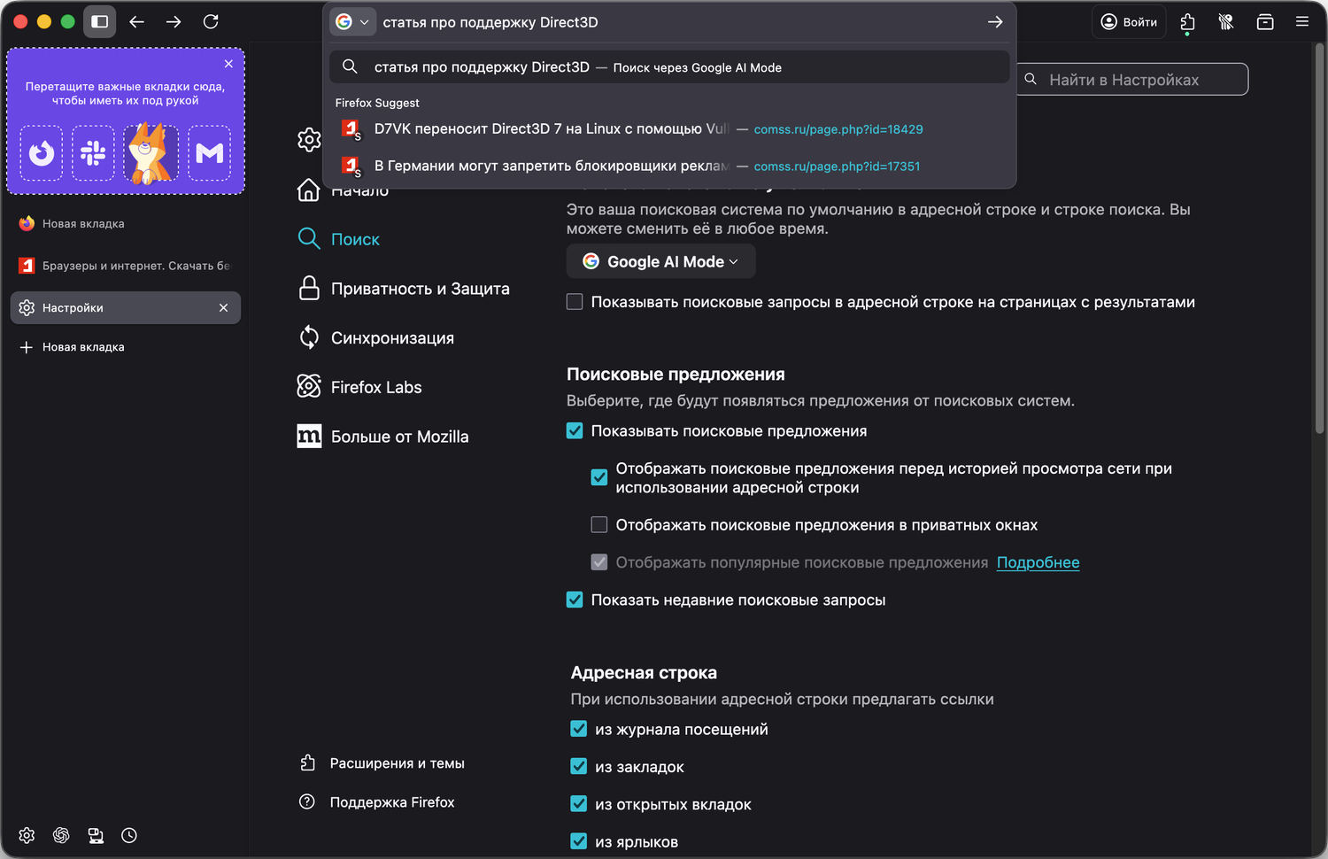 Одним из самых интересных нововведений стал экспериментальный Semantic History Search. Эта функция позволяет искать ранее посещённые страницы с помощью естественных фраз и понятийных запросов — например, «та статья про Linux и Varnish». Вся обработка выполняется локально, без отправки данных на серверы Mozilla, что обеспечивает высокий уровень конфиденциальности.