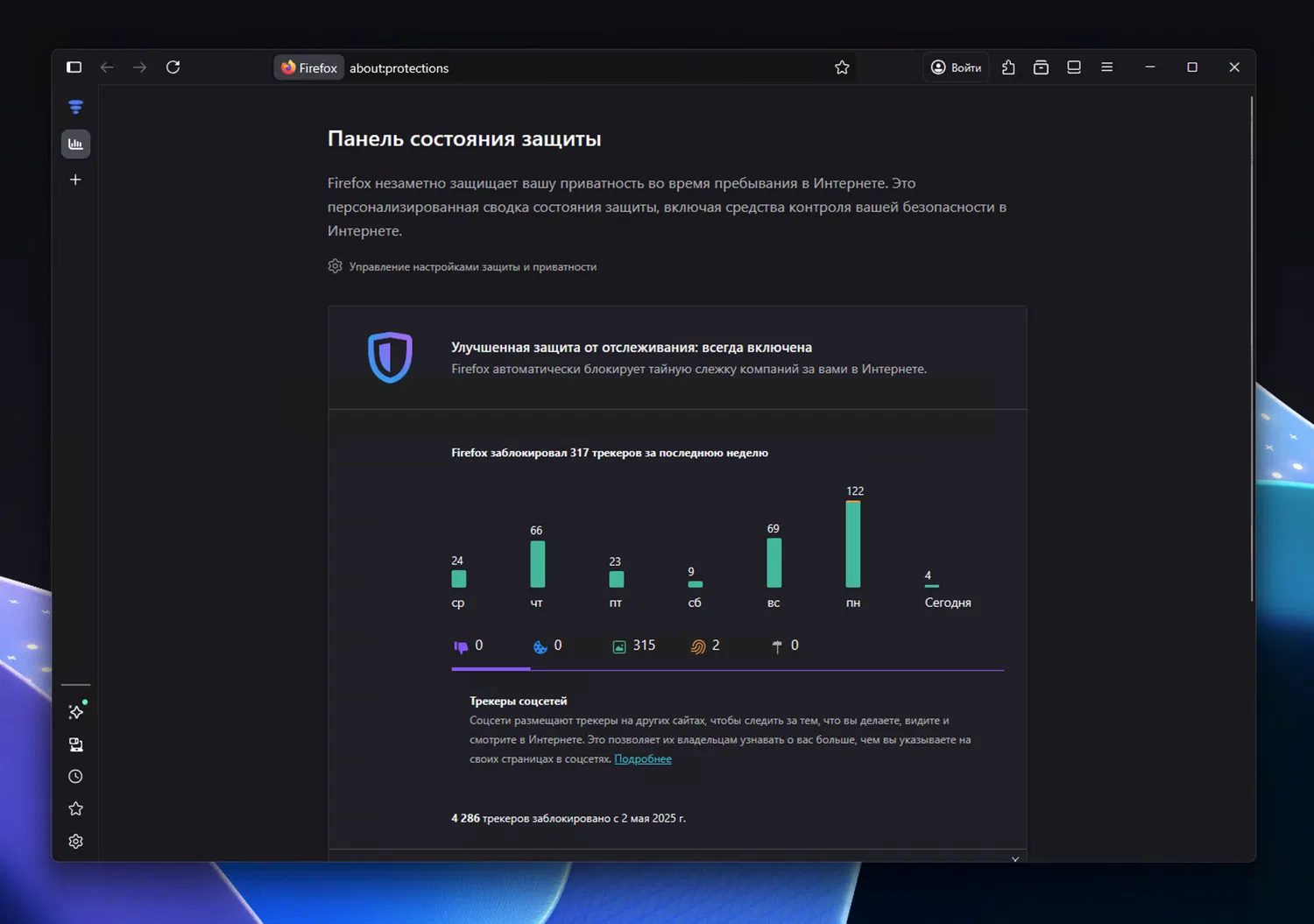 Firefox давно оснащен функциями «Расширенная защита от отслеживания» (Enhanced Tracking Protection) и «Полная защита от кук» (Total Cookie Protection), которые блокируют трекеры и рекламные сети. По данным Mozilla, только за последние месяцы эти инструменты предотвратили миллионы попыток слежки.