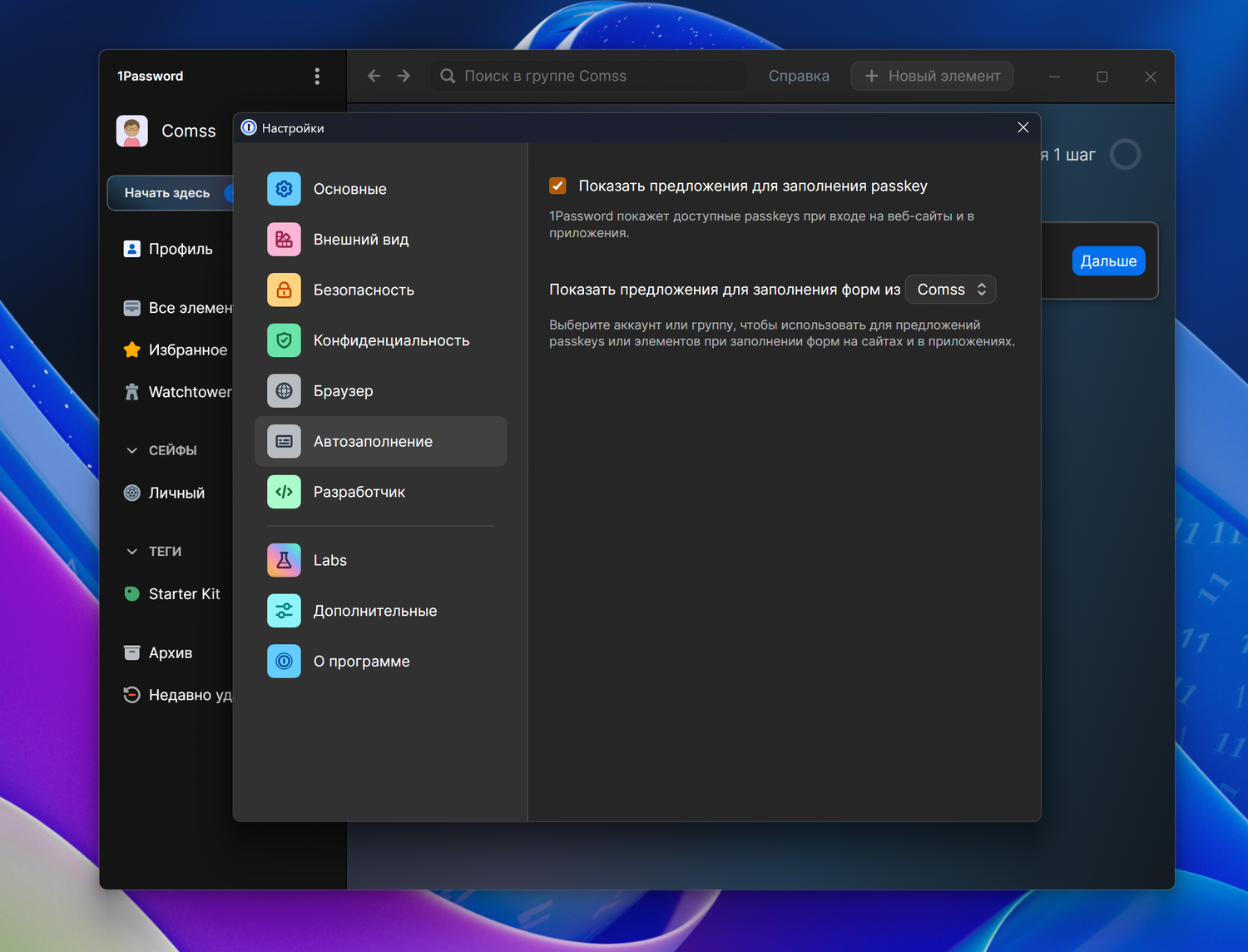 После установки 1Password предложит включить управление ключами доступа. Если этого не произошло, можно сделать это вручную в настройках: Настройки > Автозаполнение > Показывать предложения для заполнения passkey.