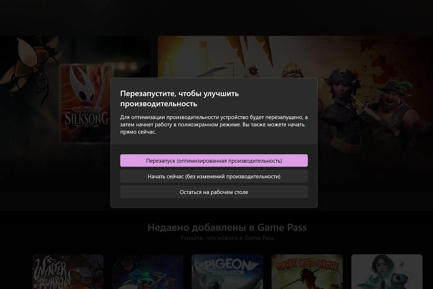 Это позволяет гибко управлять набором фоновых процессов: оставить необходимые сервисы (чат-клиенты, драйверы, оверлеи) и отключить всё лишнее для максимальной производительности. Если после выхода на рабочий стол Windows предложит перезагрузку, чтобы вернуть оптимизированное состояние Полноэкранного режима Xbox — это нормальное поведение. Перезагрузка не обязательна, но может повысить производительность.