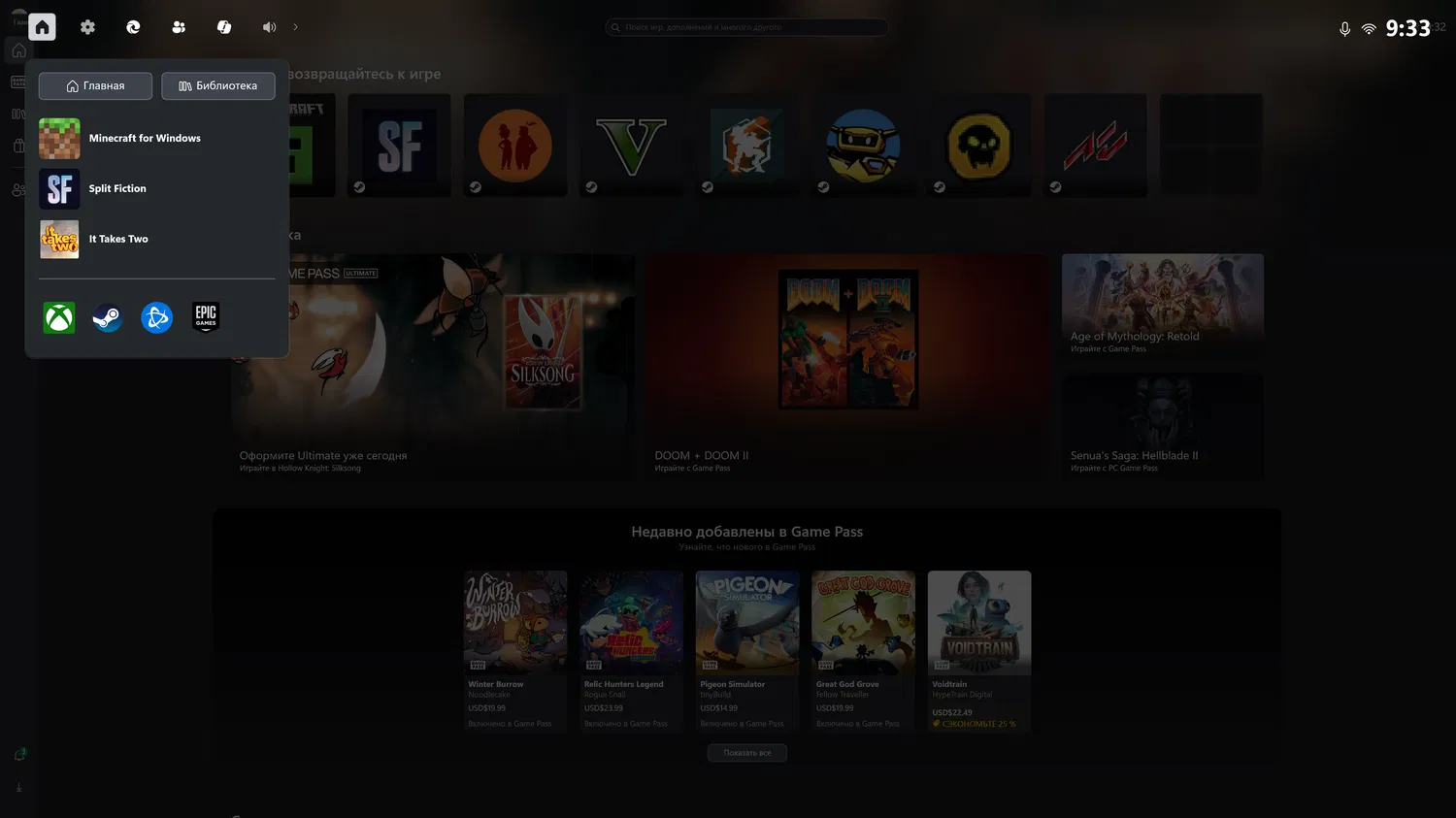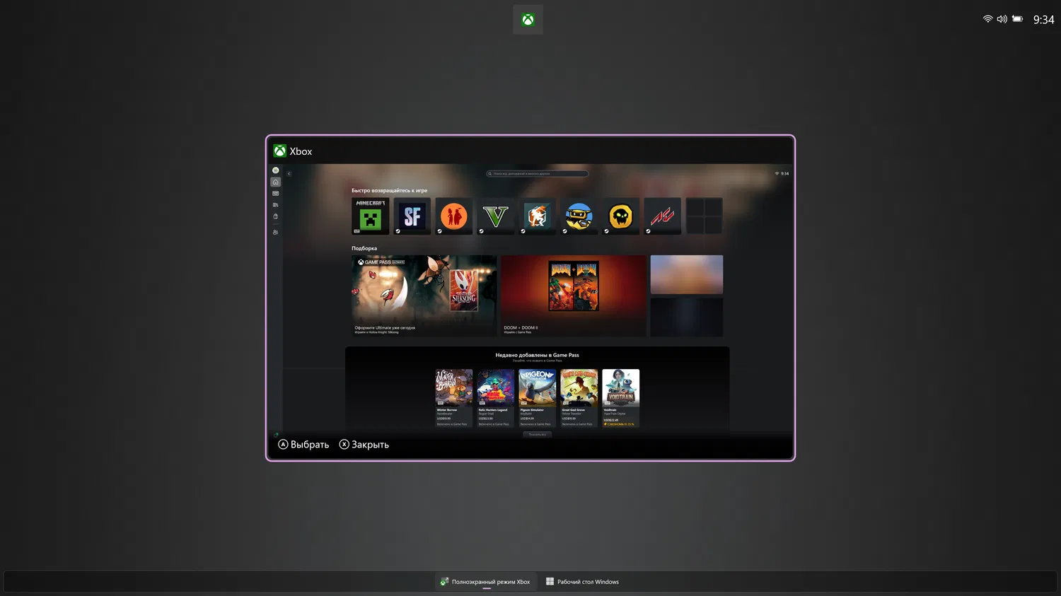 Навигация и управление: Интерфейс оптимизирован под геймпад. Нажатие кнопки Xbox (или Win+G) открывает Game Bar с быстрым доступом к виджетам, громкости, переключению аудиоустройств, меню питания и сетевым настройкам. Долгое удержание кнопки Xbox вызывает представление всех запущенных приложений, позволяя выбрать нужное, развернуть (кнопка A) или закрыть его (кнопка X). Вернуться на домашний экран Xbox можно кнопкой Главная в Game Bar или выбором плитки Xbox среди открытых приложений.