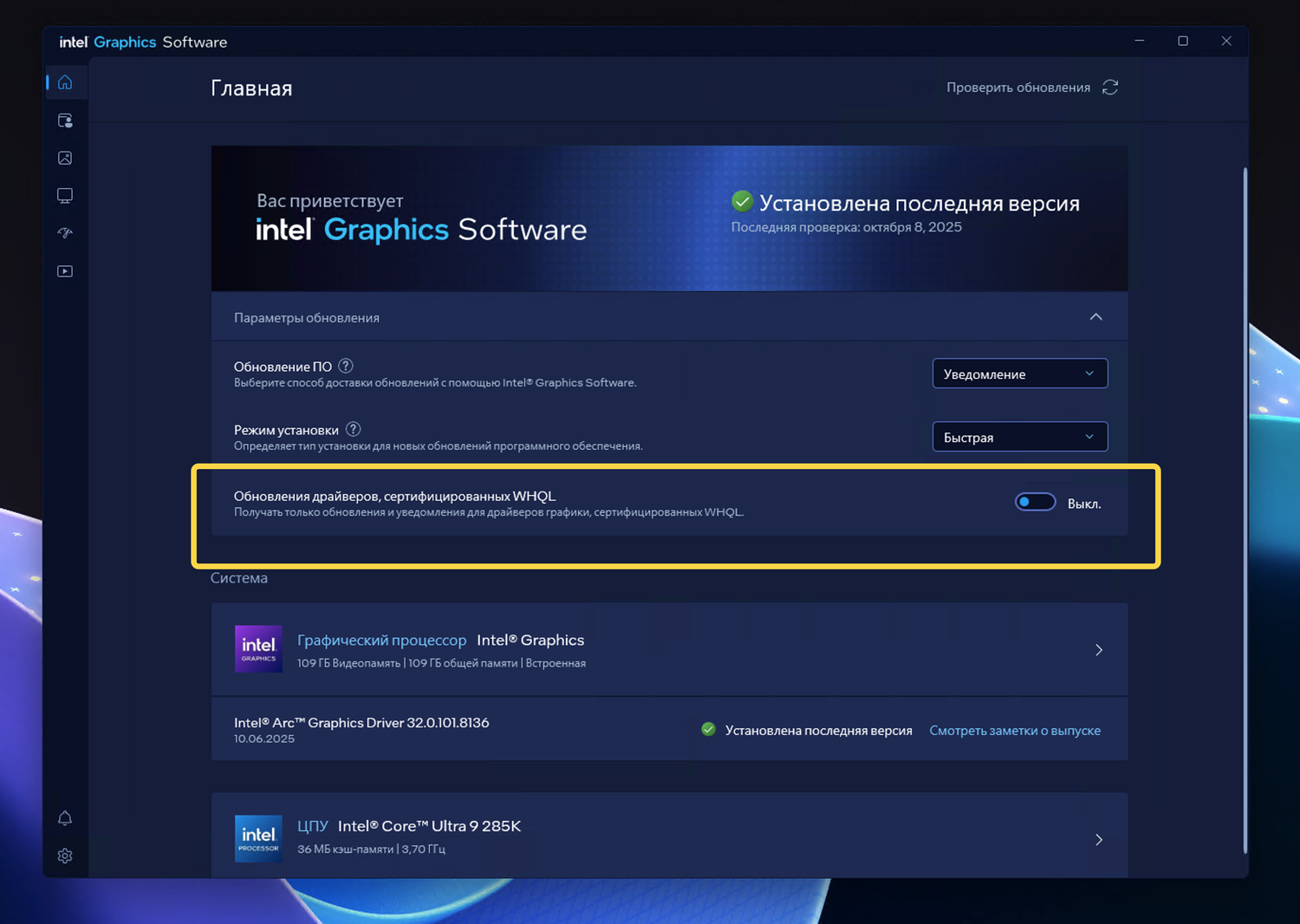 Обновление Intel Arc Graphics Driver версии 32.0.101.8250 Non-WHQL доступно для скачивания через Intel Graphics Software (если отключена опция "Обновления драйверов, сертифицированных WHQL" на главной в разделе Параметры обновления), Intel Driver & Support Assistant или с официального сайта Intel.com