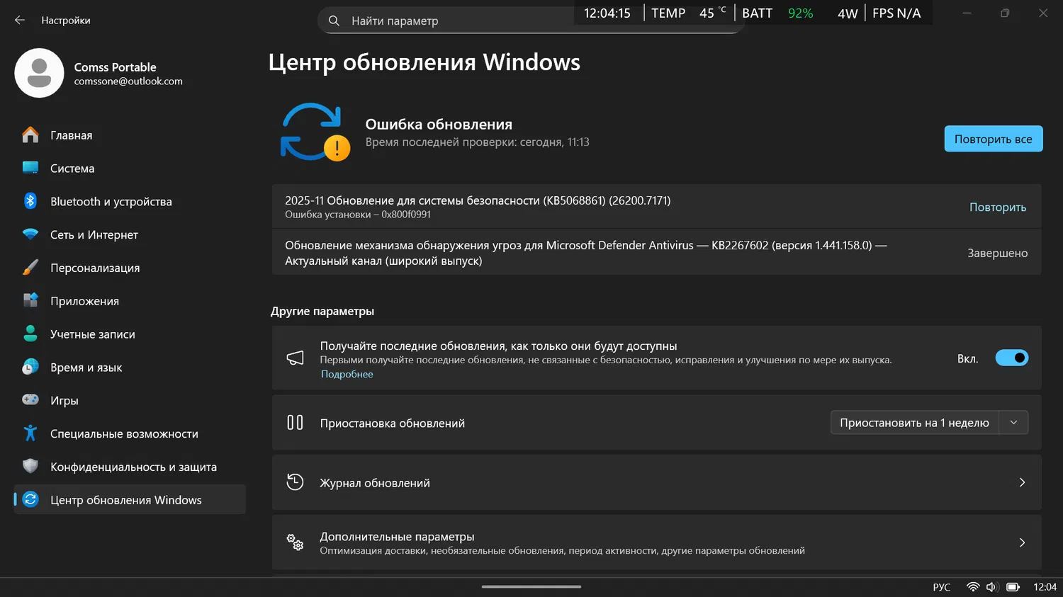 Пользователи портативной консоли ASUS ROG Xbox Ally X сообщают о проблемах с установкой ноябрьского обновления безопасности KB5068861 для Windows 11. При попытке установки обновление несколько раз завершается с ошибкой и кнопкой «Повторить», а в журнале Центра обновления Windows отображается код ошибки 0x800f0991 (иногда вместе с 0x80071ab0).