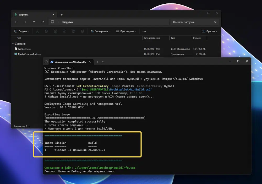 - После завершения загрузки вы получите образ с Windows 11 25H2 (26200.7171).