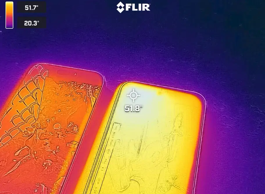 Во время попытки стабилизировать систему смартфон отключил ряд функций вроде точки доступа и фонарика, чтобы предотвратить дальнейший рост температуры. По данным тепловизора, который использовал Max Tech, корпус OnePlus 15 прогревался до 52 °C, а тепло распределялось неравномерно. Для сравнения, iPhone 17 Pro Max нагревался примерно до 40 °C, и прогрев шел более равномерно.