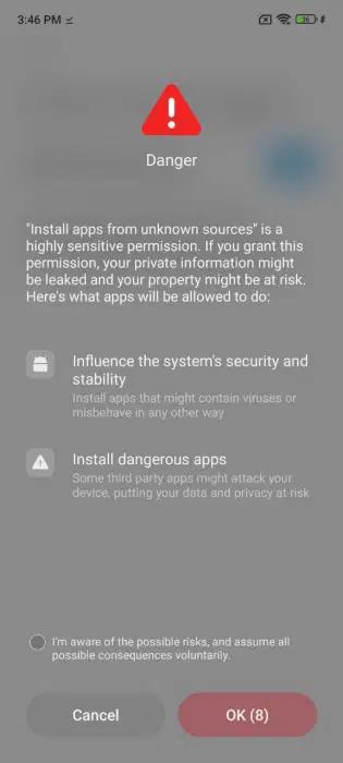 Функция напоминает систему, используемую Xiaomi в HyperOS (и ранее в MIUI). При попытке установить APK-файл, скачанный из интернета, смартфон выводит предупреждение о рисках безопасности и заставляет подождать около 10 секунд, прежде чем подтвердить установку.