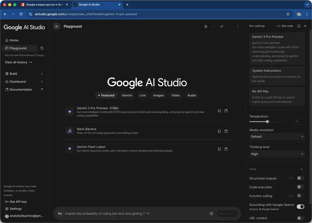 Открыть Gemini 3 Pro Preview в AI Studio