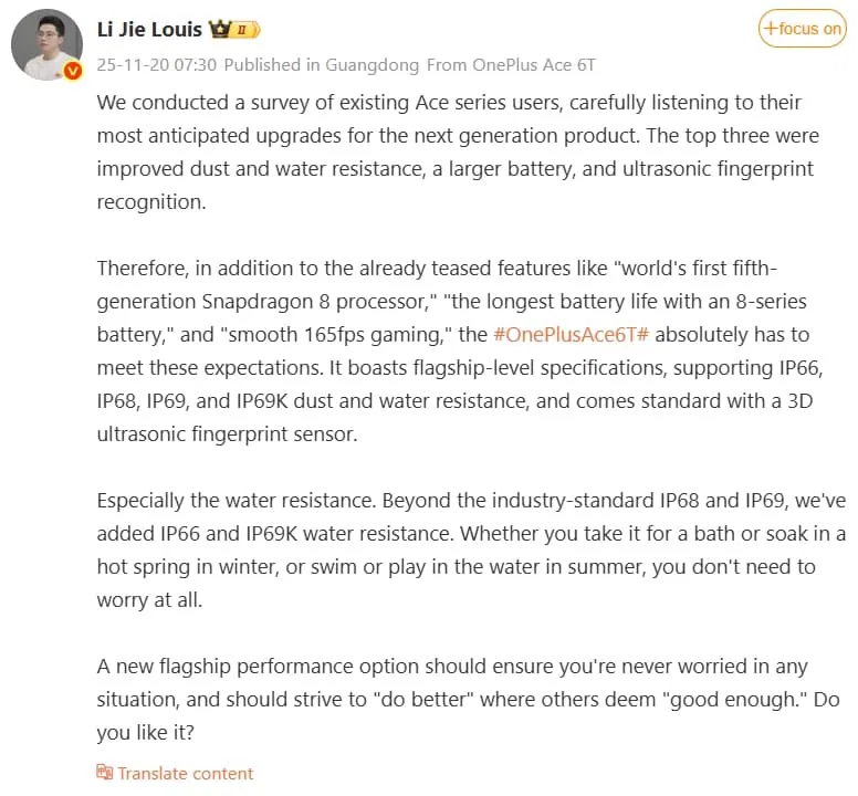 Ли Цзе Луи, президент OnePlus China, официально объявил на платформе Weibo, что OnePlus Ace 6T будет поставляться с рейтингами защиты от пыли и воды IP66, IP68, IP69 и IP69K. Он также будет оснащен ультразвуковым сканером отпечатков пальцев.