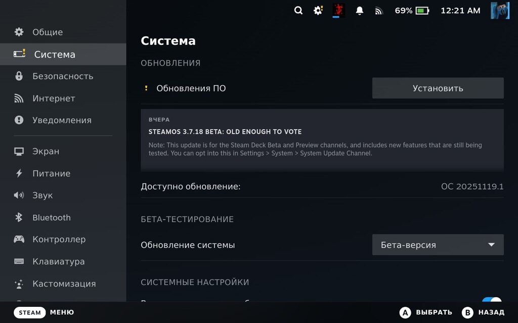 SteamOS 3.7.18 Beta доступна на каналах Beta (Бета-версия) или Preview (Ранняя сборка). Чтобы получить обновление, перейдите в Настройки > Система > Бета-тестирование и выберите один из этих вариантов.