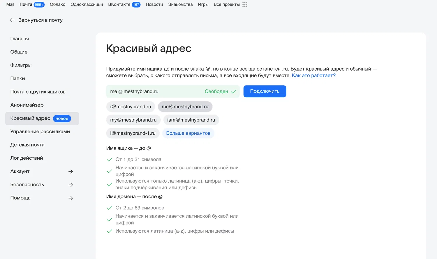 Регистрация домена и создание уникального почтового ящика происходит прямо в интерфейсе Mail — достаточно выполнить несколько шагов. Новый адрес автоматически привяжется к основному аккаунту, а пользователь сможет отправлять и получать письма с него в один клик, переключаясь между учетными записями как в веб-версии, так и в приложениях. При выборе сервис предложит свободные комбинации, основанные на предпочтениях пользователя, а при занятости имени — покажет похожие варианты.