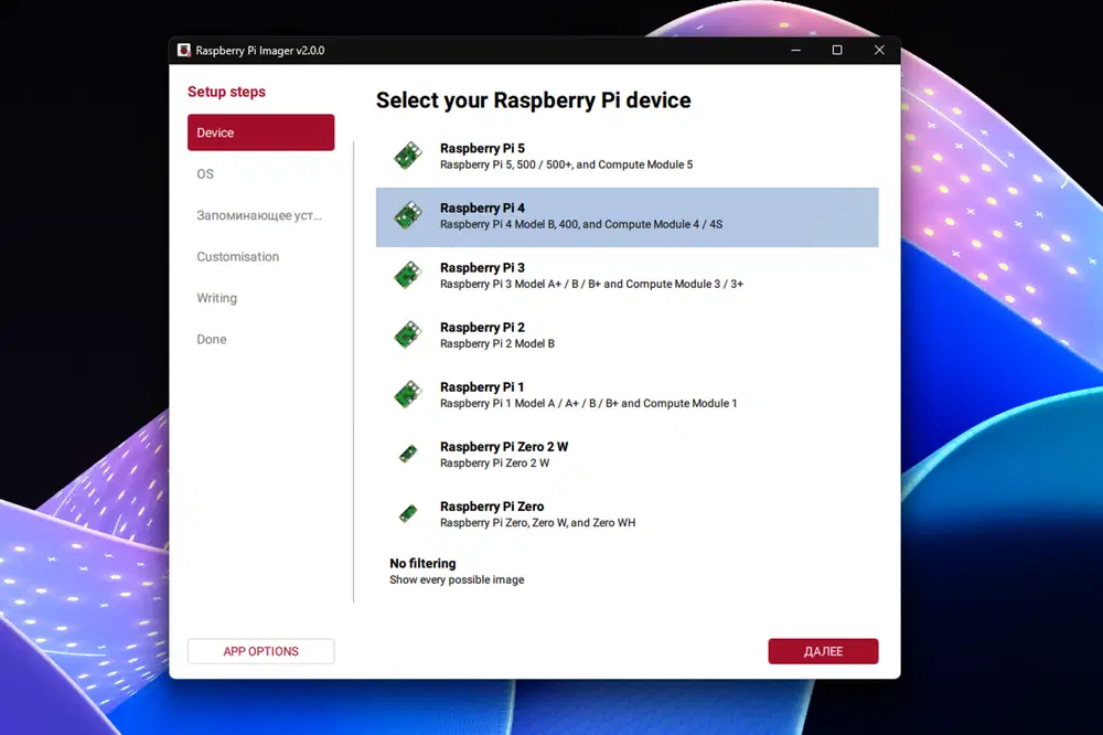 - выбор устройства (модели Raspberry Pi),