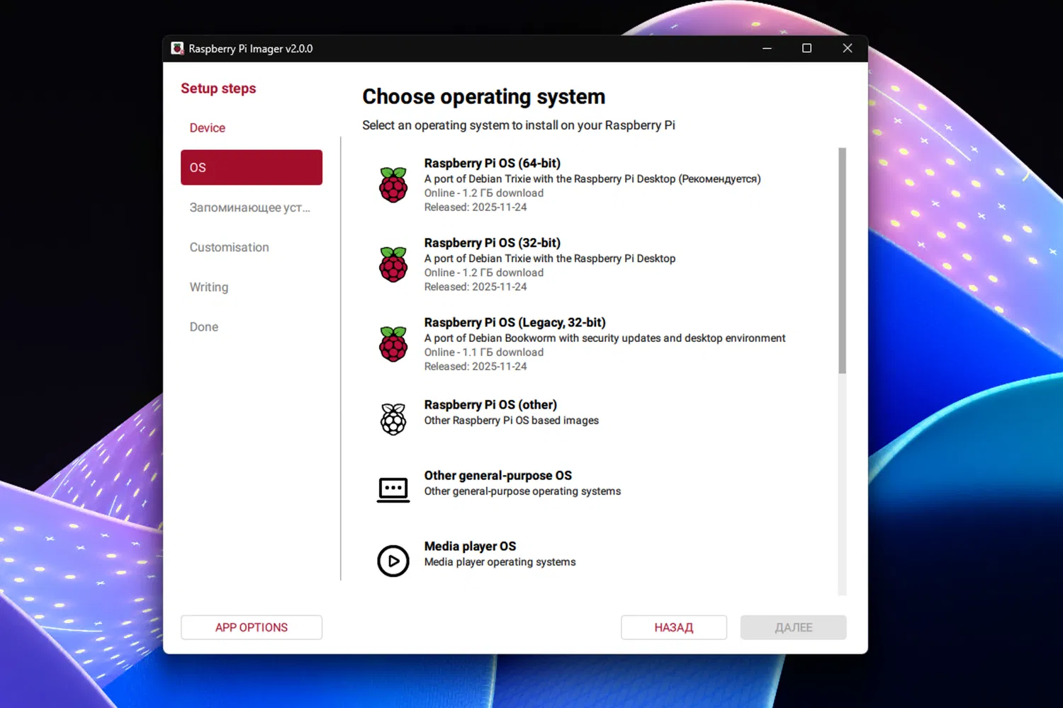 Через Raspberry Pi Imager 2.0.0 можно записывать:
