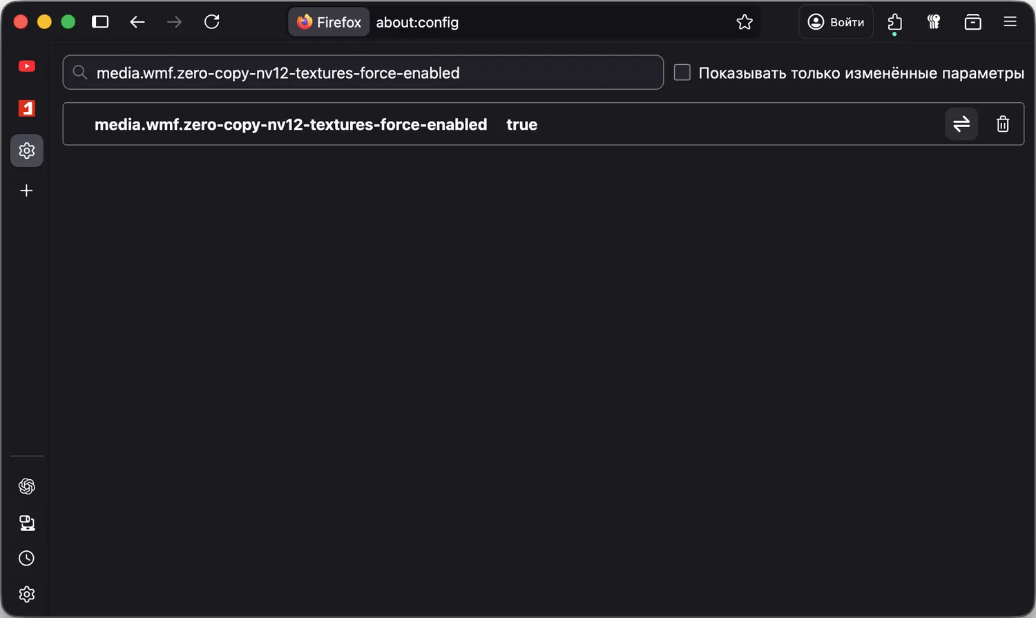 about:config. - Найдите параметр media.wmf.zero-copy-nv12-textures-force-enabled.