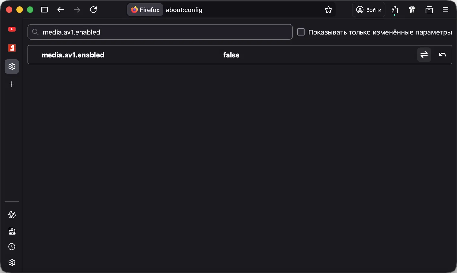 about:config. - Найдите параметр media.av1.enabled.