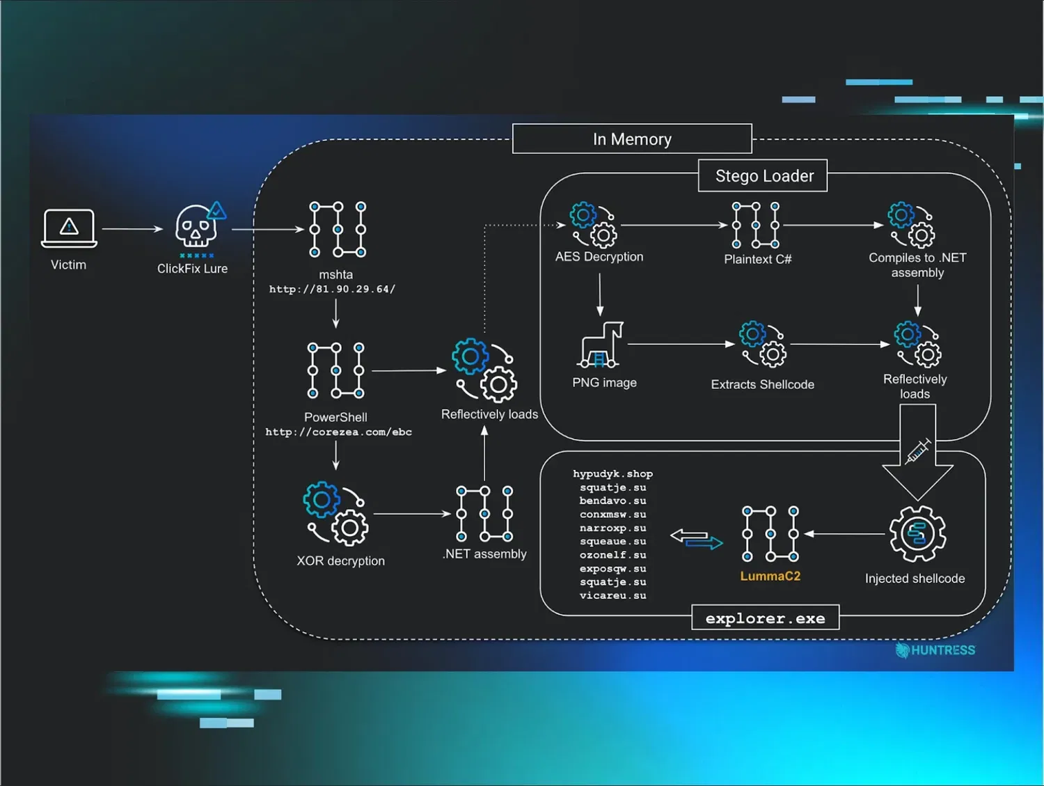 После распаковки специалисты Huntress смогли восстановить вредоносы — в рассматриваемых атаках ими были LummaC2 и Rhadamanthys.