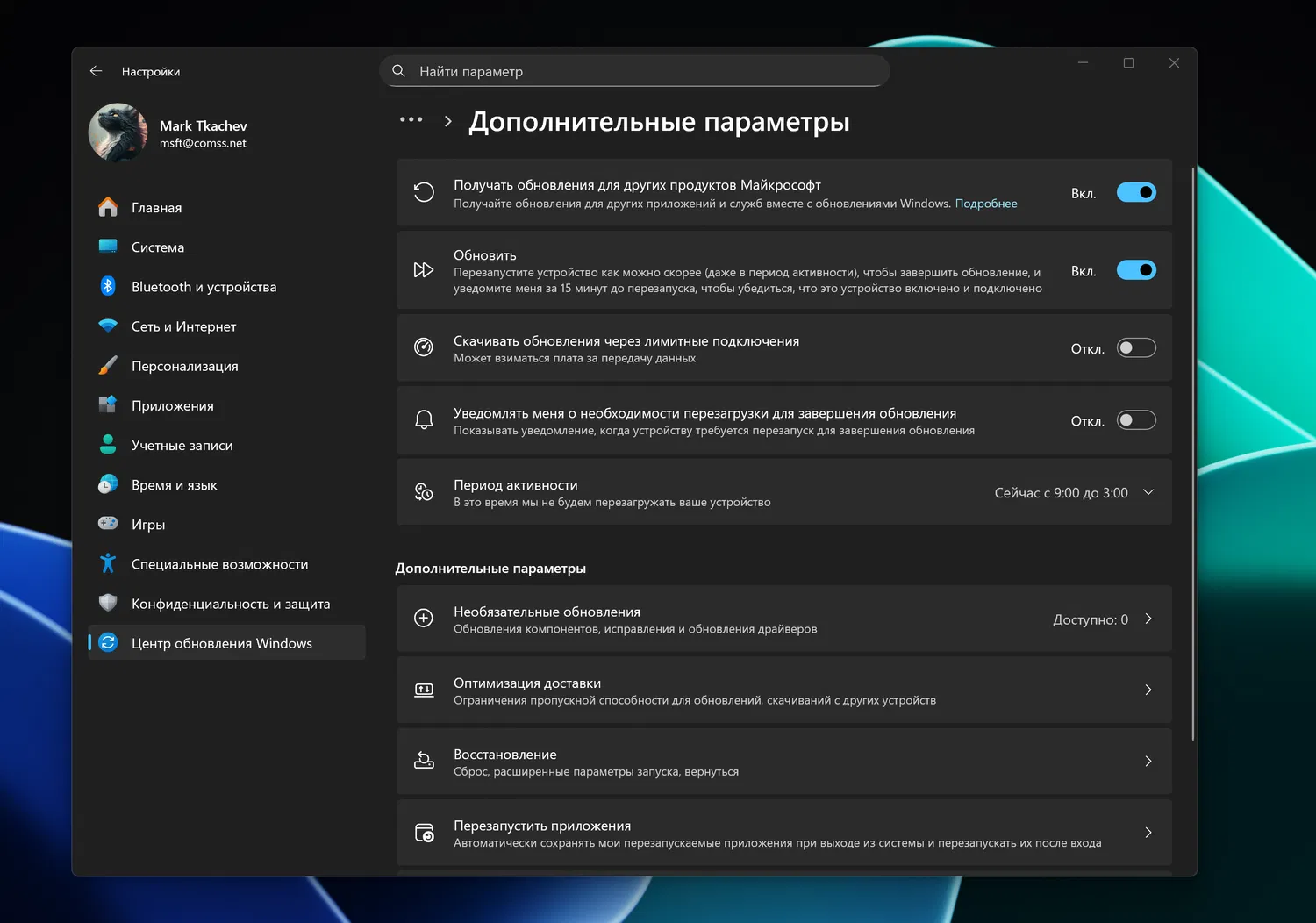 Раздел «Дополнительные параметры» (Advanced Options) на новой странице ведет в раздел «Центр обновления Windows > Дополнительные параметры».