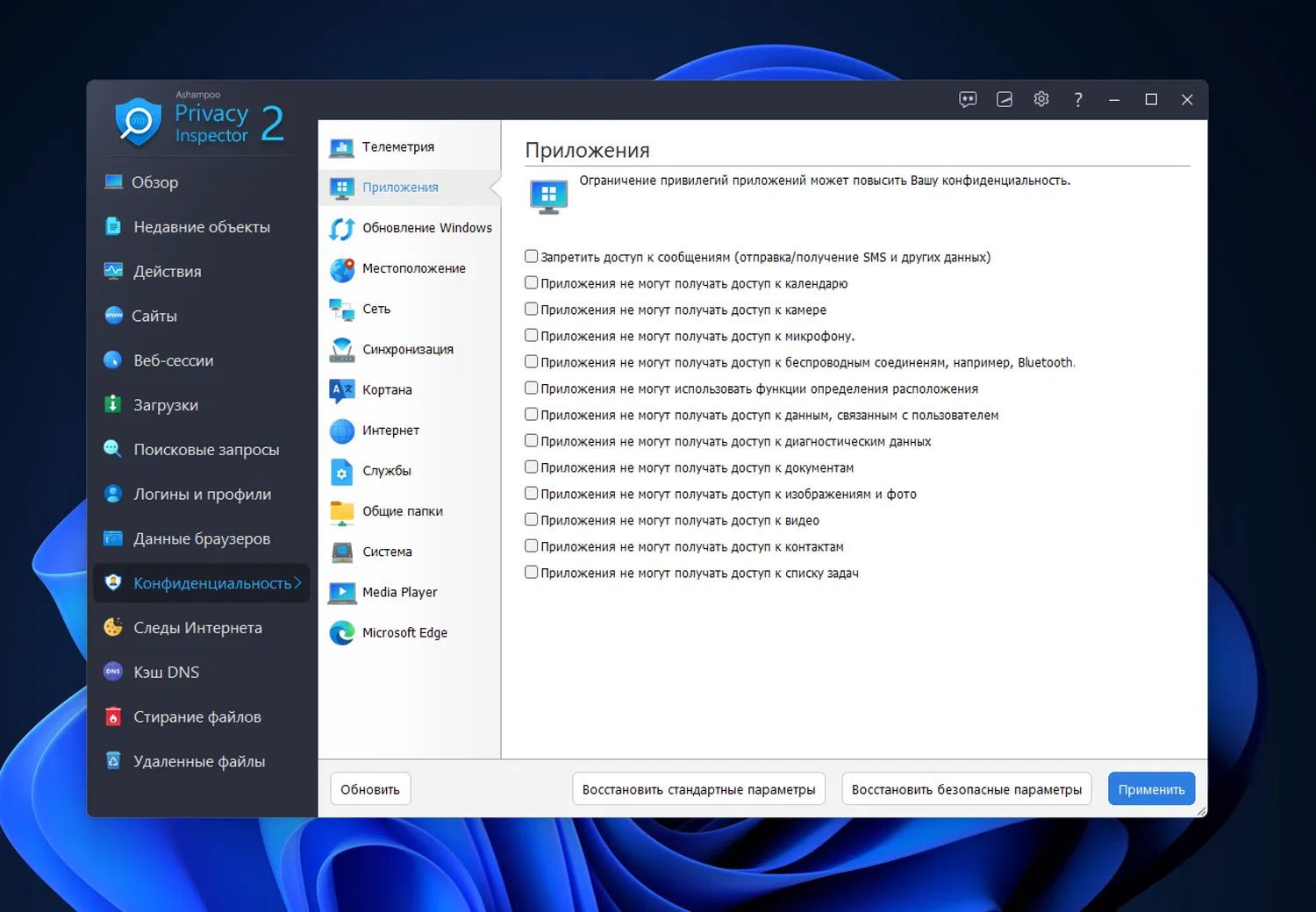 - Расширенные настройки приватности Windows и приложений, включая отключение телеметрии.