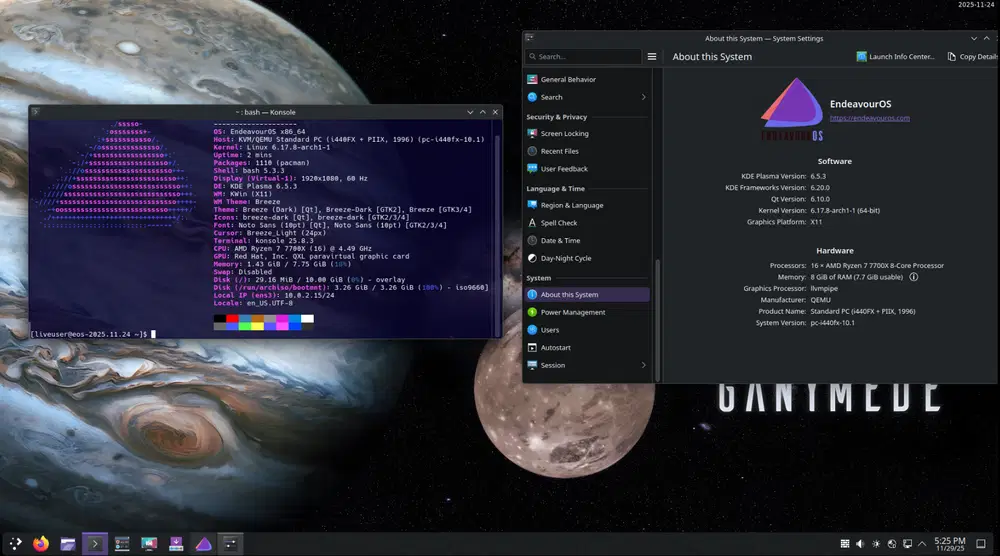 Для чистой установки системы новый образ EndeavourOS Ganymede уже доступен для загрузки. Текущим пользователям дистрибутива переустановка не требуется - для получения всех нововведений достаточно выполнить стандартную команду обновления системы: pacman -Syu.
