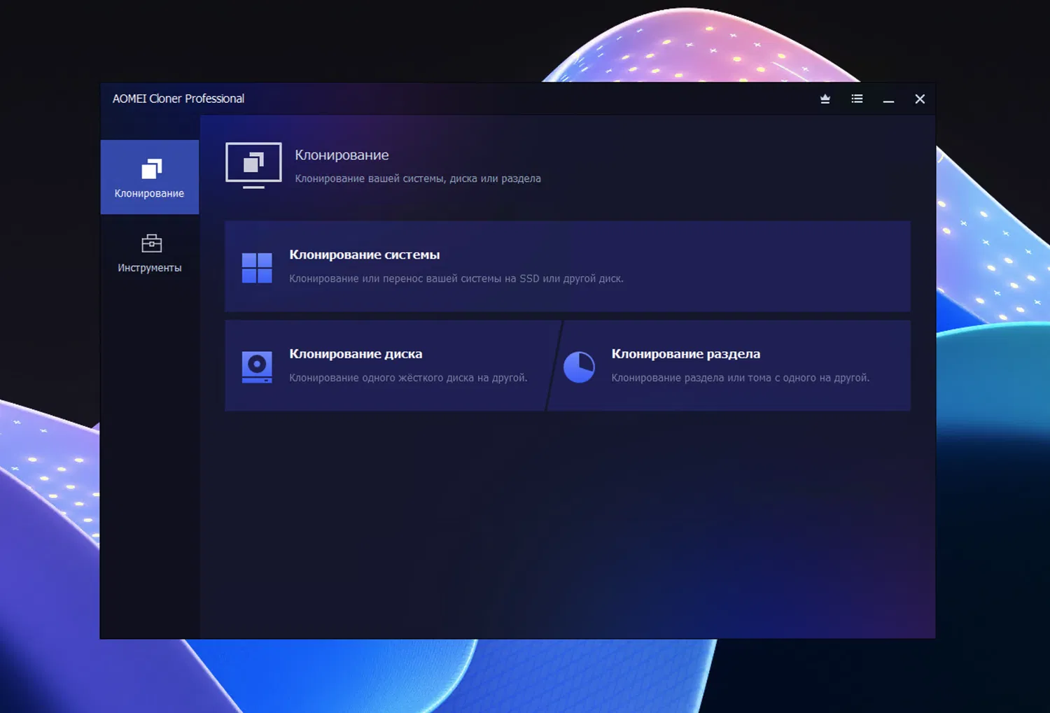 AOMEI Cloner Pro — мощная и удобная программа для клонирования операционной системы, дисков и отдельных разделов в Windows. Она позволяет быстро перенести Windows на новый SSD или HDD без переустановки, заменить устаревший или повреждённый диск, а также создать точную рабочую копию системы для резервного восстановления.