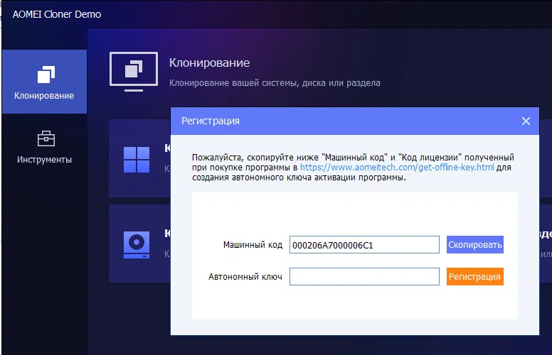 2. После установки запустите программу и активируйте полную версию AOMEI Cloner Pro в Меню > Регистрация, используя следующий лицензионный ключ (License Code):