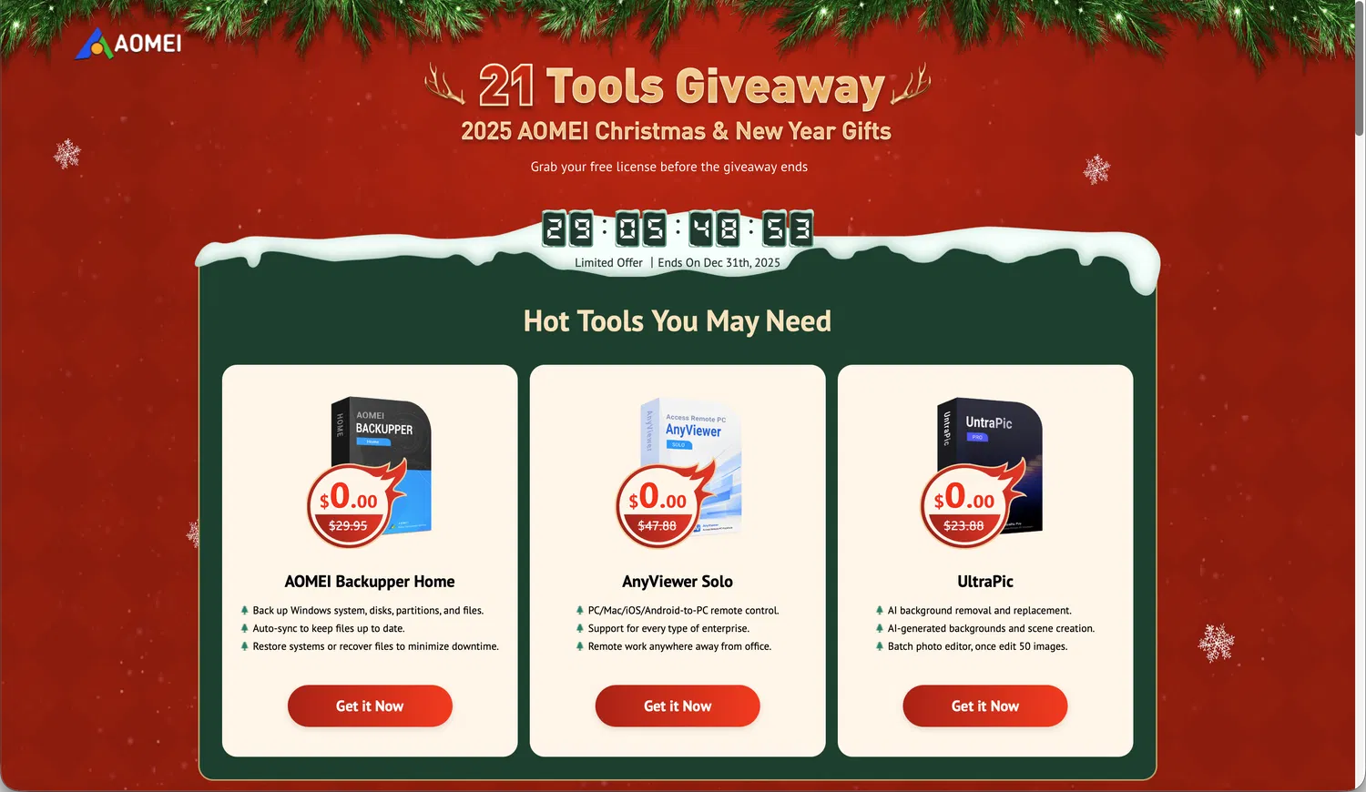 Компания AOMEI традиционно устраивает масштабные раздачи перед Новым годом и Рождеством. В 2025 году акция продлится до 31 декабря 2025 года, и любой желающий может скачать популярные приложения, которые обычно стоят десятки или даже сотни долларов.