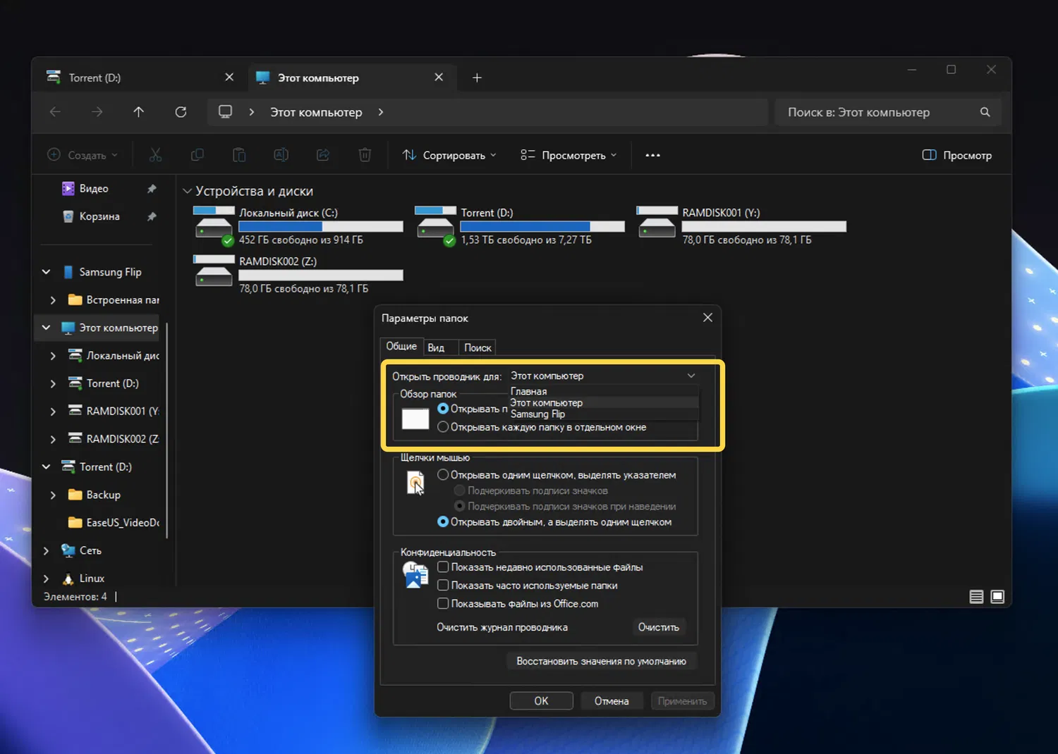 Чтобы изменить папку запуска, нужно открыть Проводник, нажать на кнопку с тремя точками на панели инструментов и выбрать «Параметры». В разделе «Общие» в пункте «Открыть Проводник для» выбрать вариант «Этот компьютер».