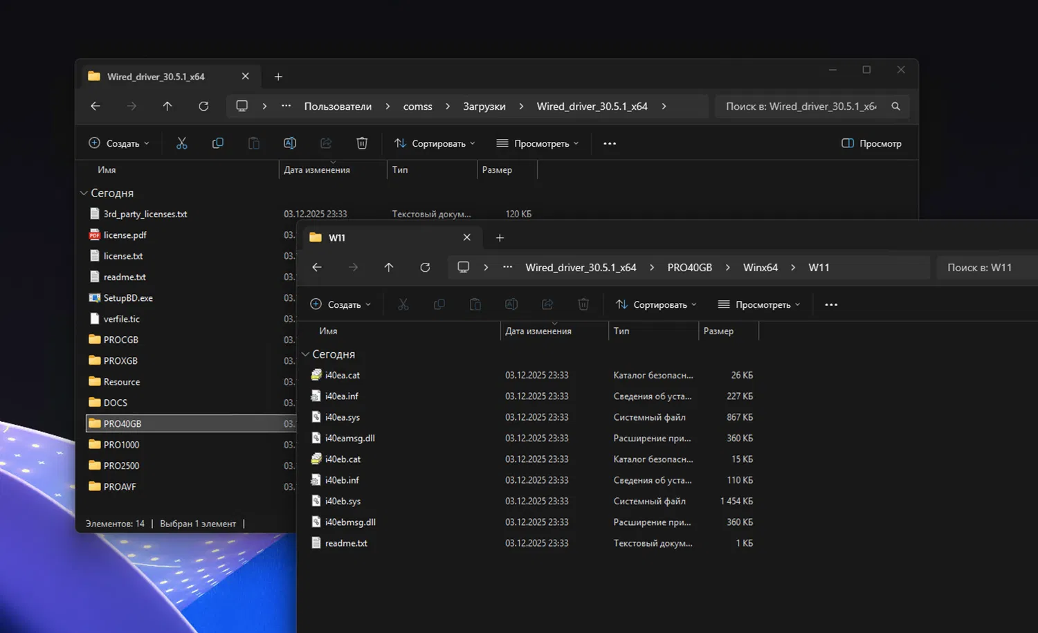 Примечание: драйверы i40ea и i40eb полностью сертифицированы для Windows 11 24H2; для Windows 11 25H2 — находятся в режиме «поддерживается».