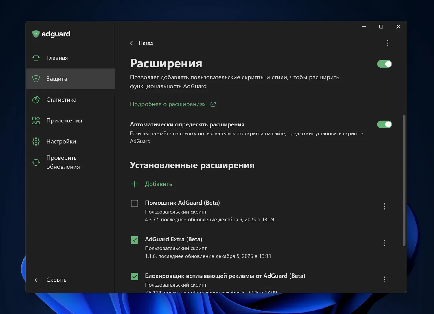 Раздел Пользовательские скрипты получил новое название — теперь он называется Расширения. Такое именование давно знакомо пользователям браузеров и лучше отражает назначение функций. Кроме того, в AdGuard v7 раздел назывался аналогично, что делает переход на новую версию более комфортным.